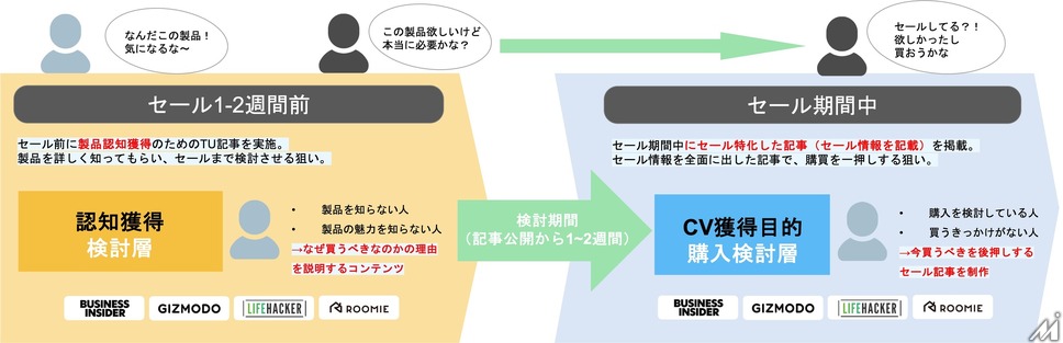 例えば大型セールのタイミングでは、セール開始より前に商品理解と購入関心度を高めるコンテンツを制作。セールタイミングでの購入の後押しを強化していきます。