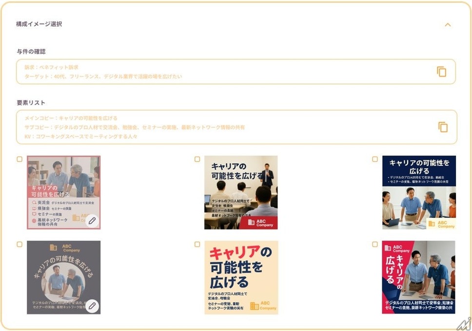 「CREATIVE BLOOM DISPLAY Ads」の主な機能として、AIを活用した4つの支援機能が実装されています。「構成案生成AI」は企業のコミュニケーション課題に合わせたバナー広告のレイアウト案を短時間で複数生成。「素材検索AI」は自然言語での検索により最適な素材画像を効率的に見つけ出します。