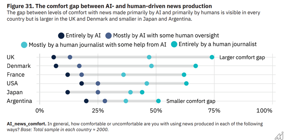 調査によると、日本では「AIが作ったニュースに快適さを感じる」人はわずか12%でした。一方で、「人間が主導し、AIが補助するニュース」には43%が肯定的で、「完全に人間が作るニュース」には62%が快適と回答しています。