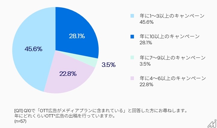 調査結果によると、OTT広告の出稿回数は「54%が年4回以上」「28%が年10回以上」となっており、継続的な活用が進んでいることがわかります。また、OTT広告活用の目的は、ブランド認知などアッパーファネルマーケティングが83%を占めています。