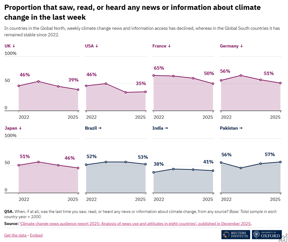 英オックスフォード大学ロイター・ジャーナリズム研究所が2025年12月に公表した「Climate Change News Audience Report 2025」は、こうした問いに対して国際比較データを提示しています。