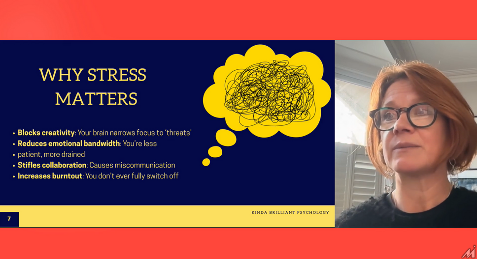 Ricca氏は講演冒頭で、メディア業界では組織戦略や構造の議論が先行し、個々人の認知状態や心理的負荷が十分に語られていないと指摘します。ストレスが高まると脳は反応優位の状態に入り、判断力を司る前頭前野の働きが低下します。その結果、恐怖や不安に基づく意思決定が増え、重要な局面ほど冷静さを欠きやすくなると説明しました。