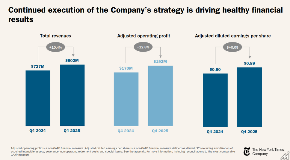 通期売上高は前年比約9%増、調整後営業利益は約5億5000万ドル(21%増)、フリーキャッシュフローは約5億5050万ドル(44%増)。Q4売上高は8億230万ドル(10.4%増)で予想を上回りました。Q4の購読収益は9.4%増の5億1050万ドルで、うちデジタル購読が14%増の3億8150万ドル。紙媒体の購読収益は2%減の1億2900万ドルと軟調が続いています。デジタル購読者のARPU(ユーザーあたり平均収益)は9.72ドルで、前年同期の9.65ドルから上昇しました。