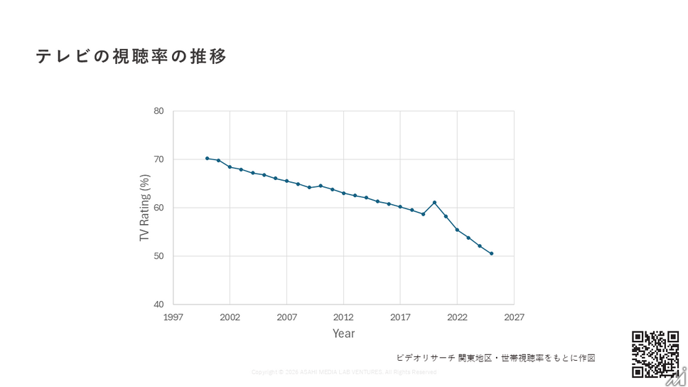 テレビの世帯視聴率の推移。1997年の約70%から長期的に下落し続けている