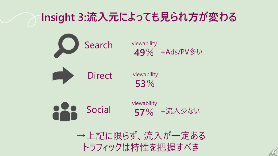 第3は流入元別の違いです。検索流入はビューアビリティがやや低い一方でアズパービュー(1ページあたりの広告表示数)が多く、ソーシャル流入はビューアビリティが高いが流入量が少ないという傾向です。流入元のセグメントによってユーザー行動が異なるため、トラフィックの特性把握が欠かせないと述べていました。