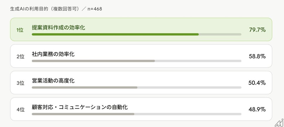 活用シーンの1位は「提案資料作成」で、全回答者の約8割が企画書・提案書の作成にAIを活用していると答えました。ゼロから企画を起こす作業のハードルがAIによって下がり、提案の量と質が同時に向上している実態が浮かび上がっています。