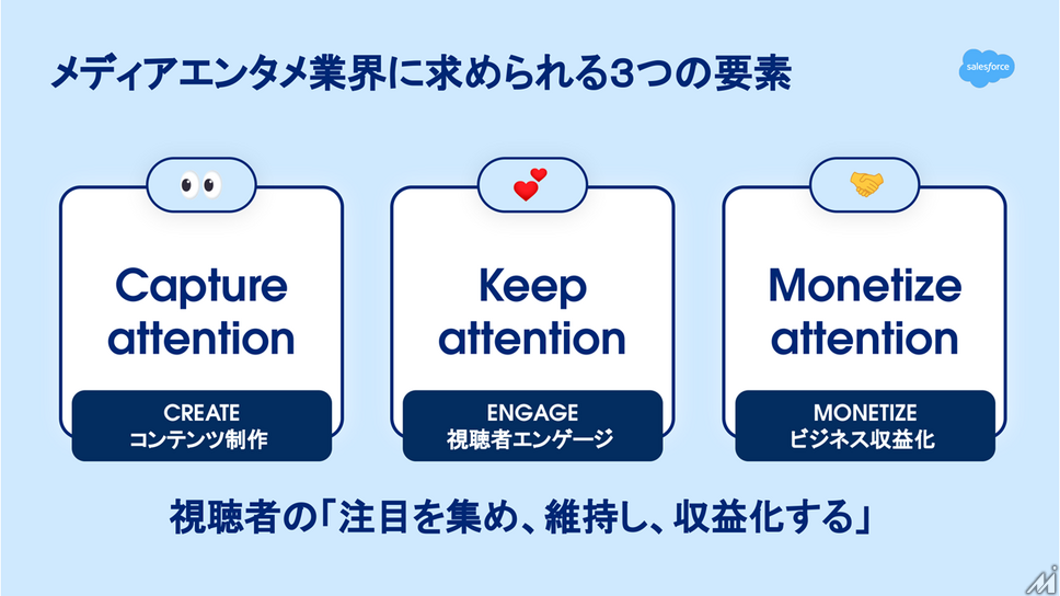 メディア・エンタメ業界に求められる要素は3つに集約されました。クリエイターが顧客の注目を引く「Capture attention」、マーケターがエンゲージメントを高める「Keep attention」、そしてそれらを実際に収益化する「Monetize attention」です。AIエージェントは、コンテンツ制作でのコラボレーション、パーソナライズされた顧客体験、そしてリソース配分の最適化という形で、これら3つの要素すべてを支援できると説明されました。