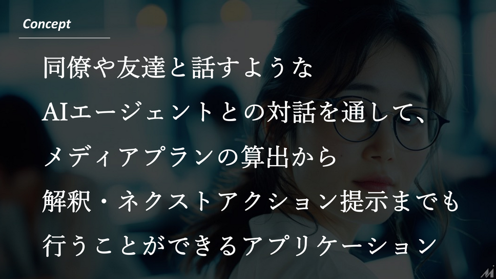 そこに生成AIを掛け合わせて開発されたのが、対話型のメディアプランニングツールです。「同僚や友達と話すようなAIエージェントとの対話を通して、メディアプランの算出から解釈、ネクストアクションの提示までを行う」というコンセプトで作られました。